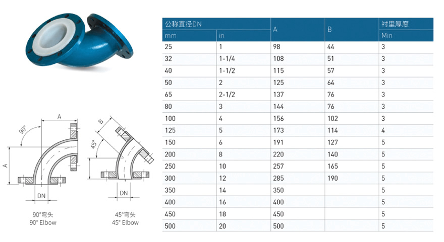 鋼襯四氟彎頭適合在壓力:-0.098~2.5Mpa,溫度200度工況中長期使用,需區分加工工藝。